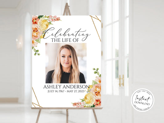 Celebration Of Life Elegant Yellow Pink Floral Funeral Welcome Sign Template E1