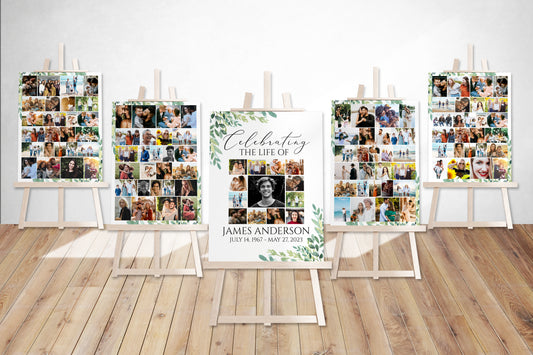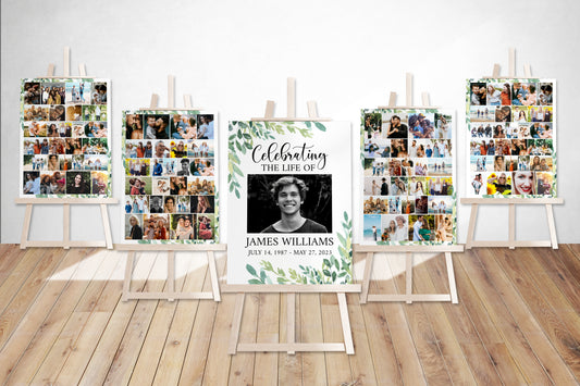 Celebration Of Life Watercolor Greenery 5 Photo Collage Funeral Welcome Sign Set Template G2