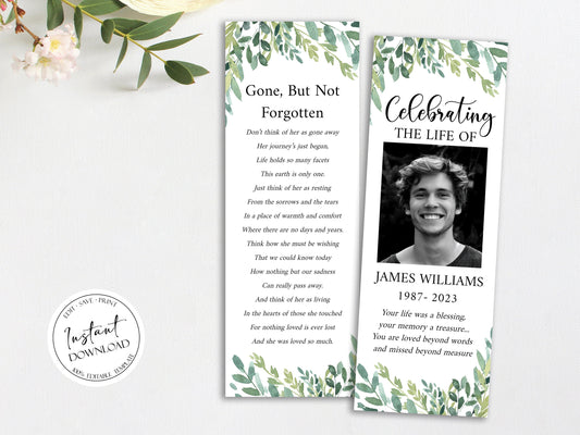 Celebration of life Watercolor Greenery Funeral Bookmark Template G2