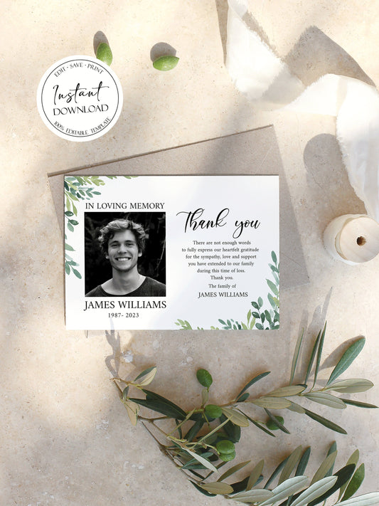 Celebration of life Watercolor Greenery Funeral Photo Thank You Card Template G2