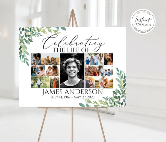 Celebration Of Life Watercolor Greenery Photo Collage Funeral Welcome Sign Template G2