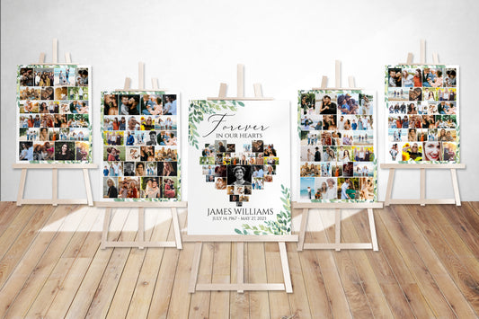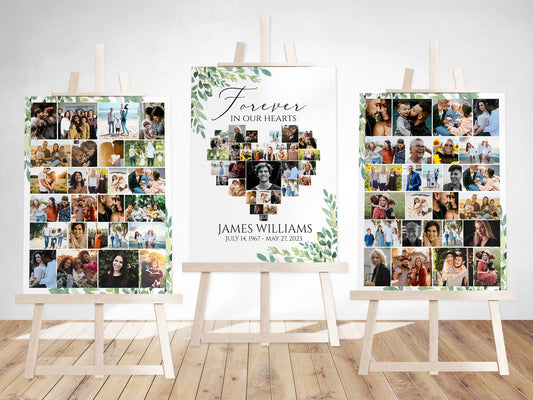 Forever in our Hearts Watercolor Greenery Heart Photo Collage Funeral Welcome Sign Template G2