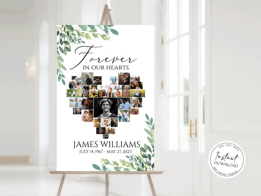 Forever in our Hearts Watercolor Greenery Heart Photo Collage Funeral Welcome Sign Template G2