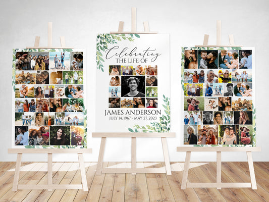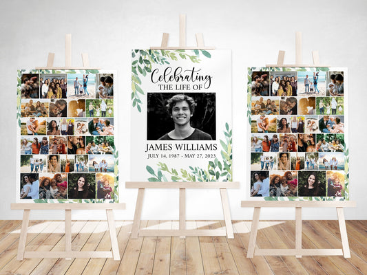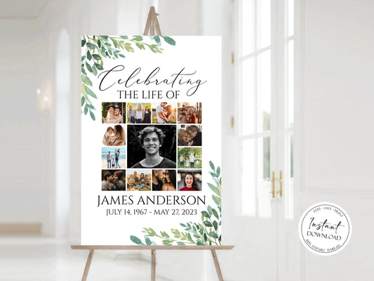 Celebration Of Life Watercolor Greenery Photo Collage Funeral Welcome Sign Template G2