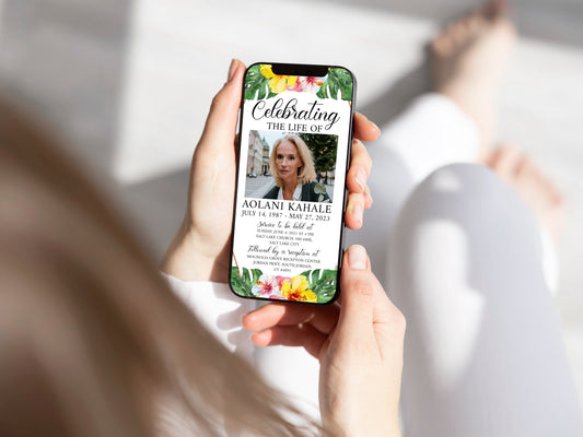 Celebration of life Hawaiian Tropical Plumeria Digital Funeral Invitation Template H1