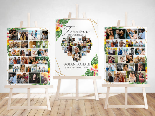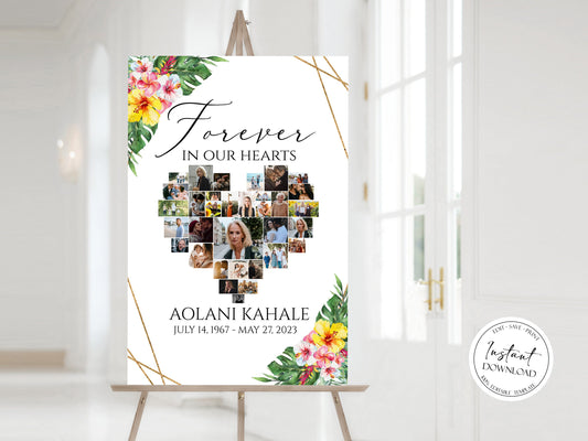 Forever in our Hearts Tropical Hawaiian Plumeria Heart Photo Collage Funeral Welcome Sign Set Templates H1