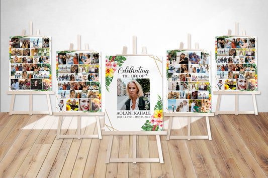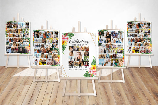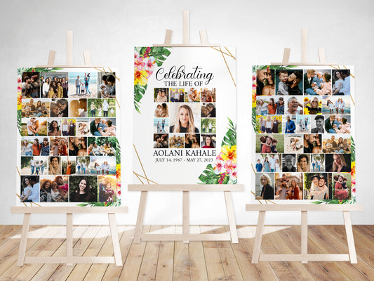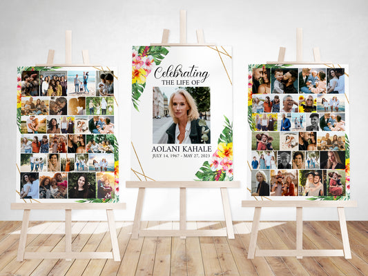 Celebration Of Life Tropical Hawaiian Plumeria 5 Photo Collage Funeral Welcome Sign Set Template H1