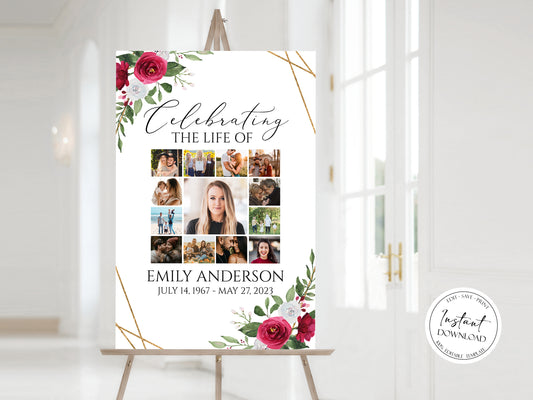 Celebration Of Life White Pink Roses Photo Collage Funeral Welcome Sign Template P2