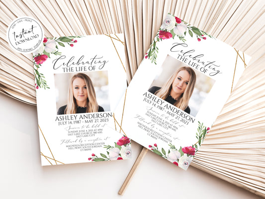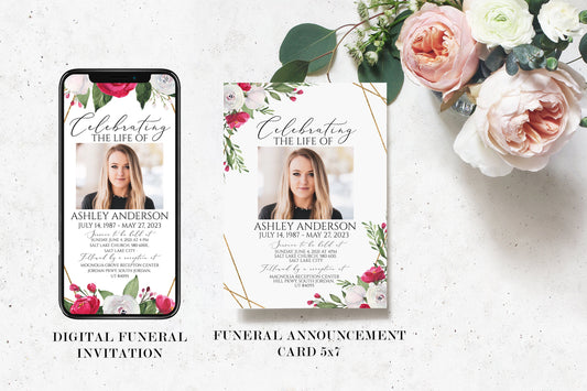 Celebration of life White Pink Roses Funeral Invitation Template P2