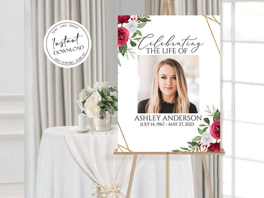 Celebration Of Life White Pink Roses Funeral Welcome Sign Template P2