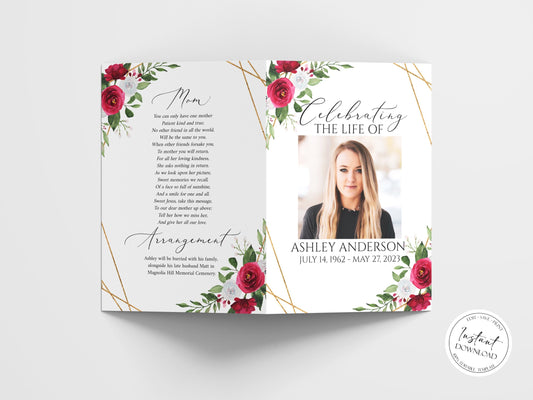 11x17 Celebration of life White Pink Roses Gold Funeral Program Template P2