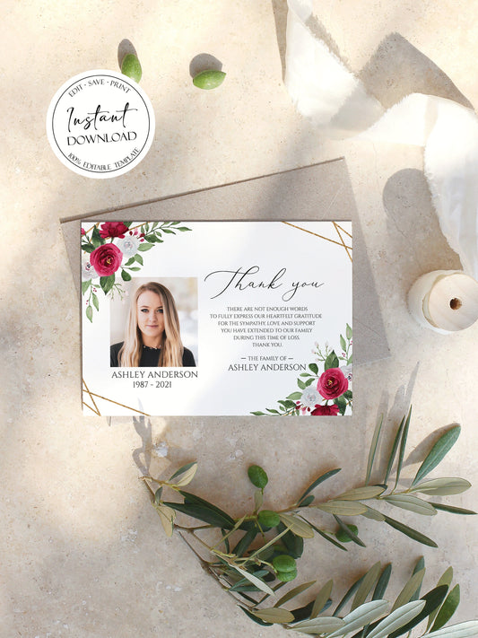 Celebration of life White Pink Roses Funeral Photo Thank you Card Template P2