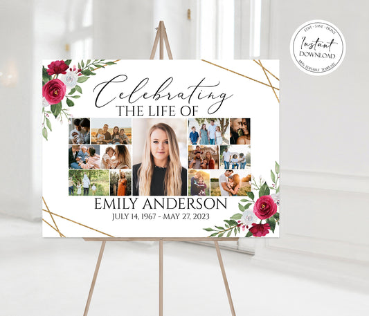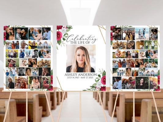 Celebration Of Life White Pink Roses Photo Collage Funeral Welcome Sign Set Templates P2