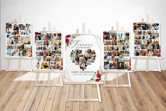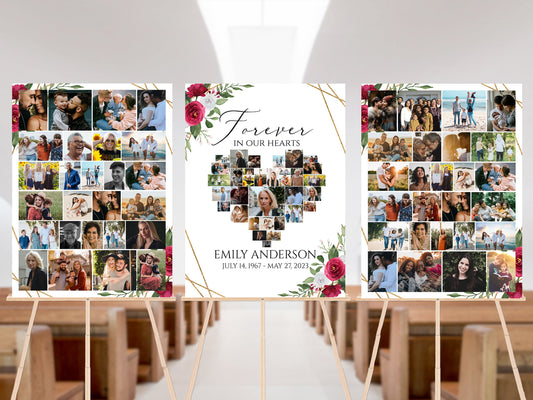 Forever in our Hearts White Pink Roses Heart Heart Photo Collage Funeral Welcome Sign Set Template P2