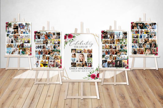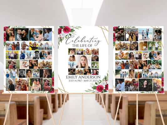 Celebration Of Life White Pink Roses Gold Funeral 5 Photo Collage Funeral Welcome Sign Set Templates P2