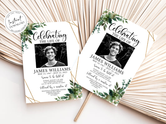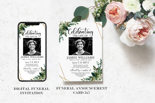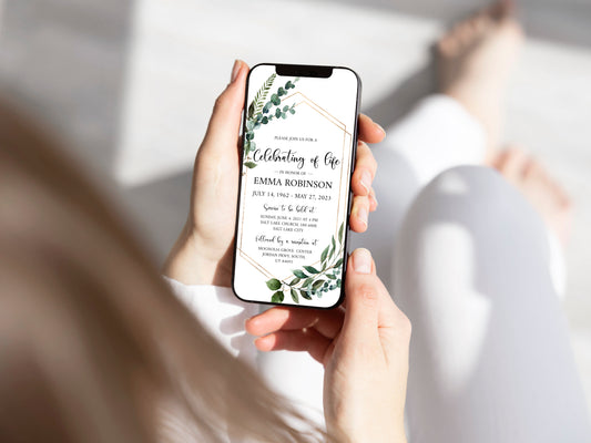 Celebration of life Watercolor Greenery Gold Digital Funeral Invitation Template Q1