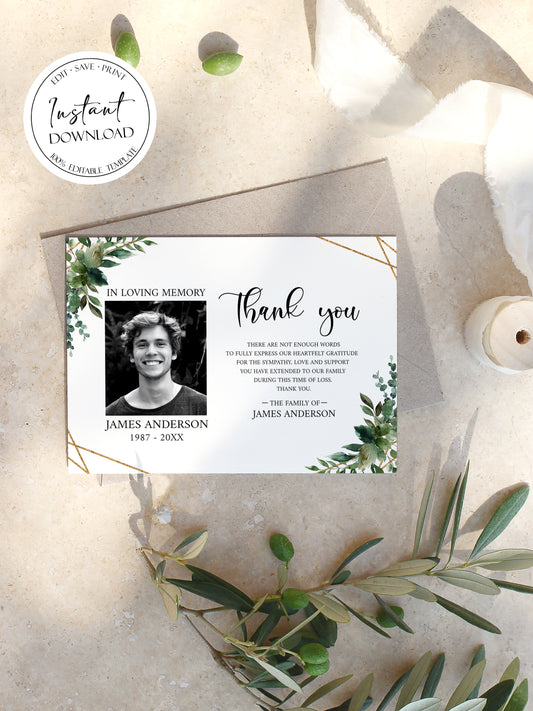 Celebration of life Watercolor Greenery Gold Funeral Photo Thank You Card Template Q1