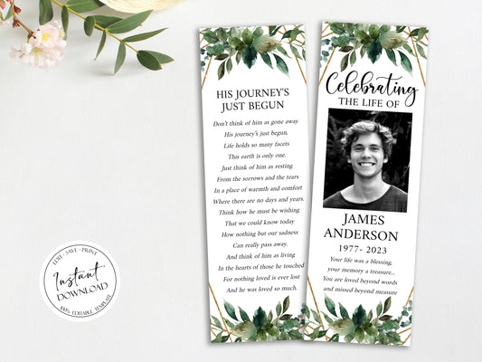 Celebration of life Watercolor Greenery Gold Funeral Bookmark Template Q1