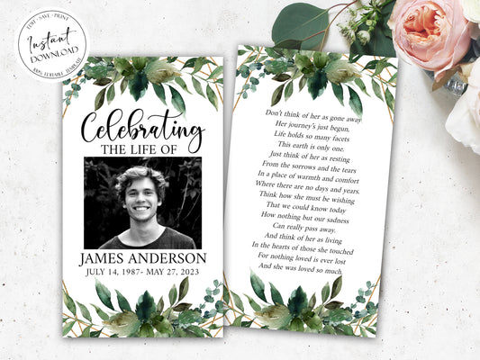 Celebration Of Life Watercolor Greenery Gold Funeral Prayer Card Template Q1