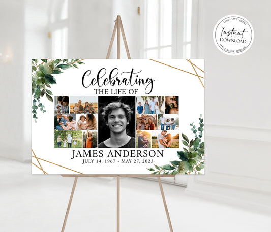 Celebration Of Life Watercolor Greenery Gold Photo Collage Funeral Welcome Sign Template Q1