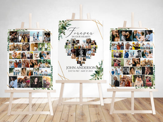 Forever in our Hearts Watercolor Greenery Gold Heart Photo Collage Funeral Welcome Sign Template Q1