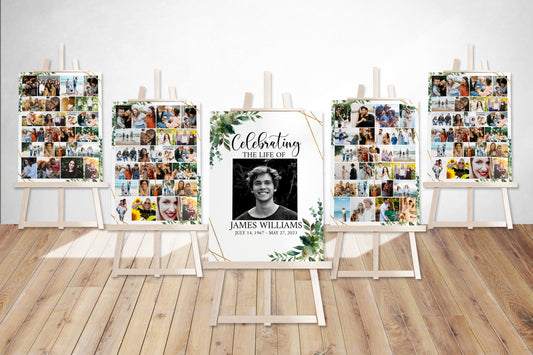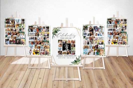 Celebration Of Life Watercolor Greenery Gold 5 Photo Collage Funeral Welcome Sign Set Template Q1