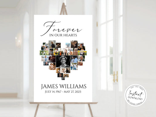 Forever in our Hearts Simple Elegant Heart Photo Collage Funeral Welcome Sign S1