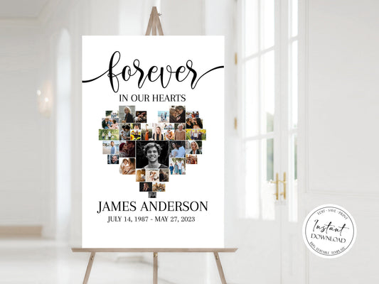 Forever in our Hearts Simple Elegant Heart Photo Collage Funeral Welcome Sign S2