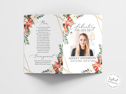 Celebration of Life Christmas Winter Red Greenery Funeral Program Template W1