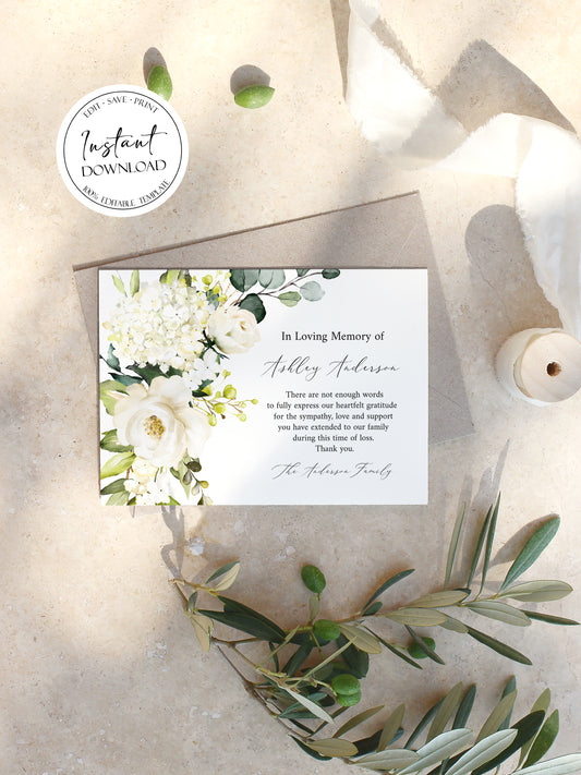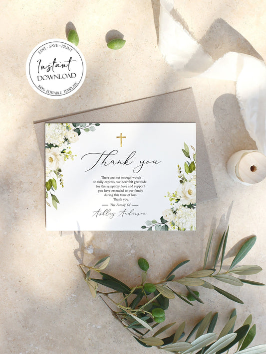In Loving Memory White Greenery Floral Gold Cross Funeral Thank you Card Template W3