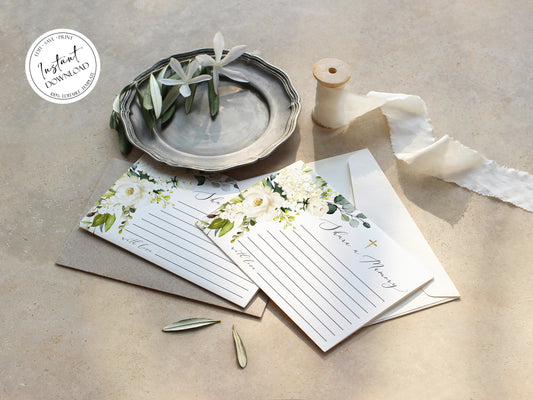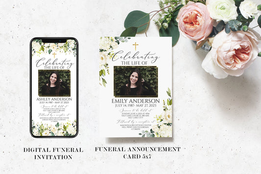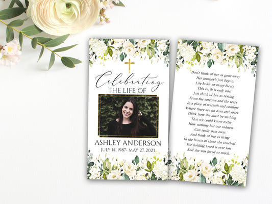 Celebration of life White Greenery Floral Gold Cross Funeral Prayer Card Template W3
