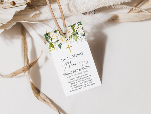 In Loving Memory White Greenery Floral Gold Cross Funeral Favor Tag Template W3