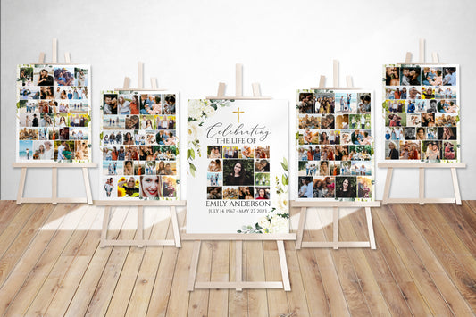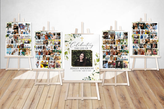Celebration Of Life White Greenery Floral Gold Cross 5 Photo Collage Funeral Welcome Sign Set Templates W3