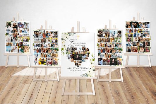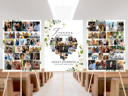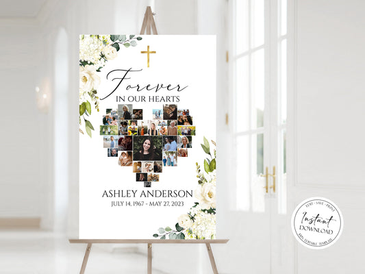 Forever in our Hearts White Greenery Floral Gold Cross Heart Photo Collage Funeral Welcome Sign Templates W3