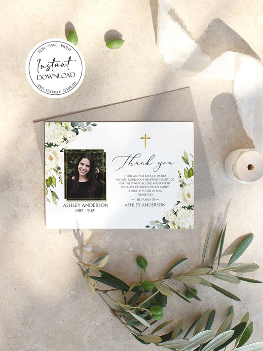 Celebration of life White Greenery Floral Gold Cross Photo Funeral Thank you Card Template W3