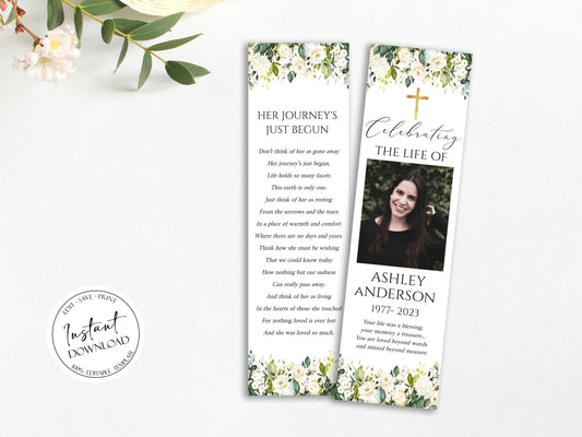 Celebration of Life White Greenery Floral Gold Cross Funeral Bookmark Template W3