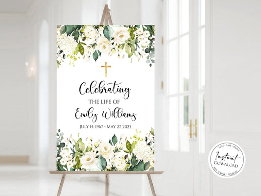 Celebration Of Life White Greenery Floral Gold Cross Funeral Welcome Sign Template W3