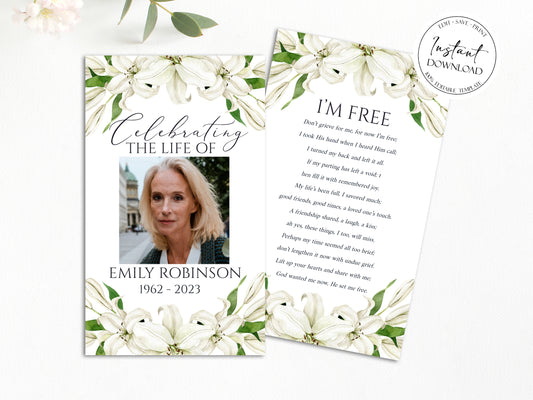 Celebration of Life White Lilies Greenery Gold Funeral Prayer Card Template WL1