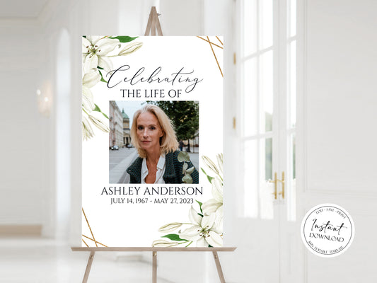 Celebration Of Life White Lilies Greenery Gold Funeral Welcome Sign Template WL1