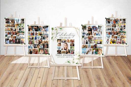 Celebration Of Life White Lilies Greenery Gold 5 Photo Collage Funeral Welcome Sign Set Templates WL1