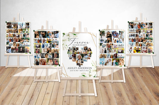Forever in our Hearts White Lilies Greenery Gold Heart Photo Collage Funeral Welcome Sign Templates WL1