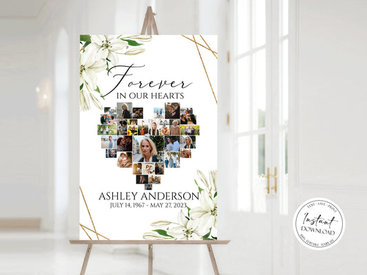 Forever in our Hearts White Lilies Greenery Gold Heart Photo Collage Funeral Welcome Sign Template WL1