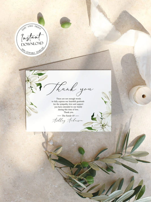 Celebration of life White Lilies Greenery Gold Funeral Thank you Card Template WL1