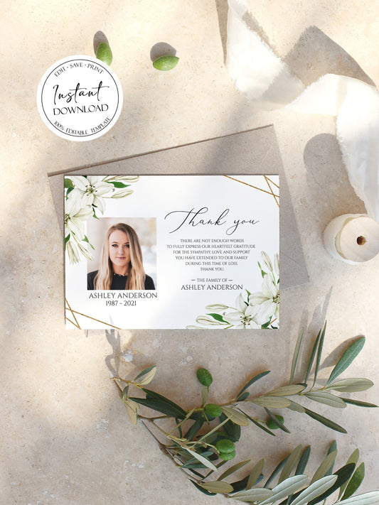 Celebration of life White Lilies Greenery Gold Photo Funeral Thank you Card Template WL1