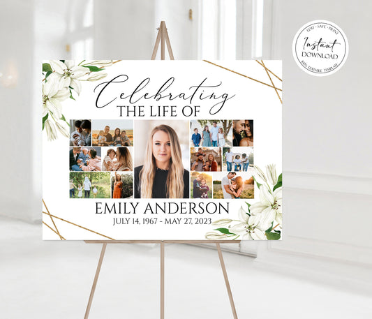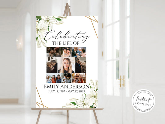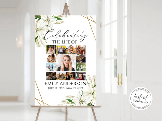 Celebration Of Life White Lilies Greenery Gold Photo Collage Funeral Welcome Sign Template WL1