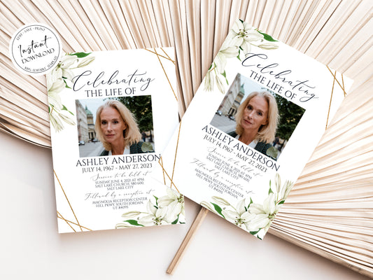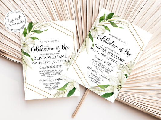 Celebration of life White Lilies Greenery Gold Funeral Invitation Template WL1