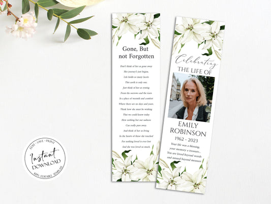 Celebration of Life White Lilies Greenery Gold Funeral Bookmark Template WL1