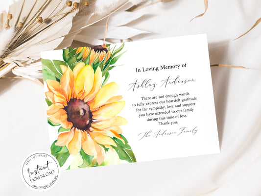 Celebration of life Sunflower Funeral Thank you Card Template Y1