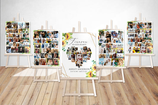 Forever in our Hearts Sunflower Gold Heart Photo Collage 5 Funeral Welcome Sign Templates Y1