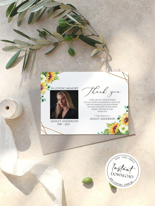 Celebration of life Sunflower Photo Funeral Thank you Card Template S1